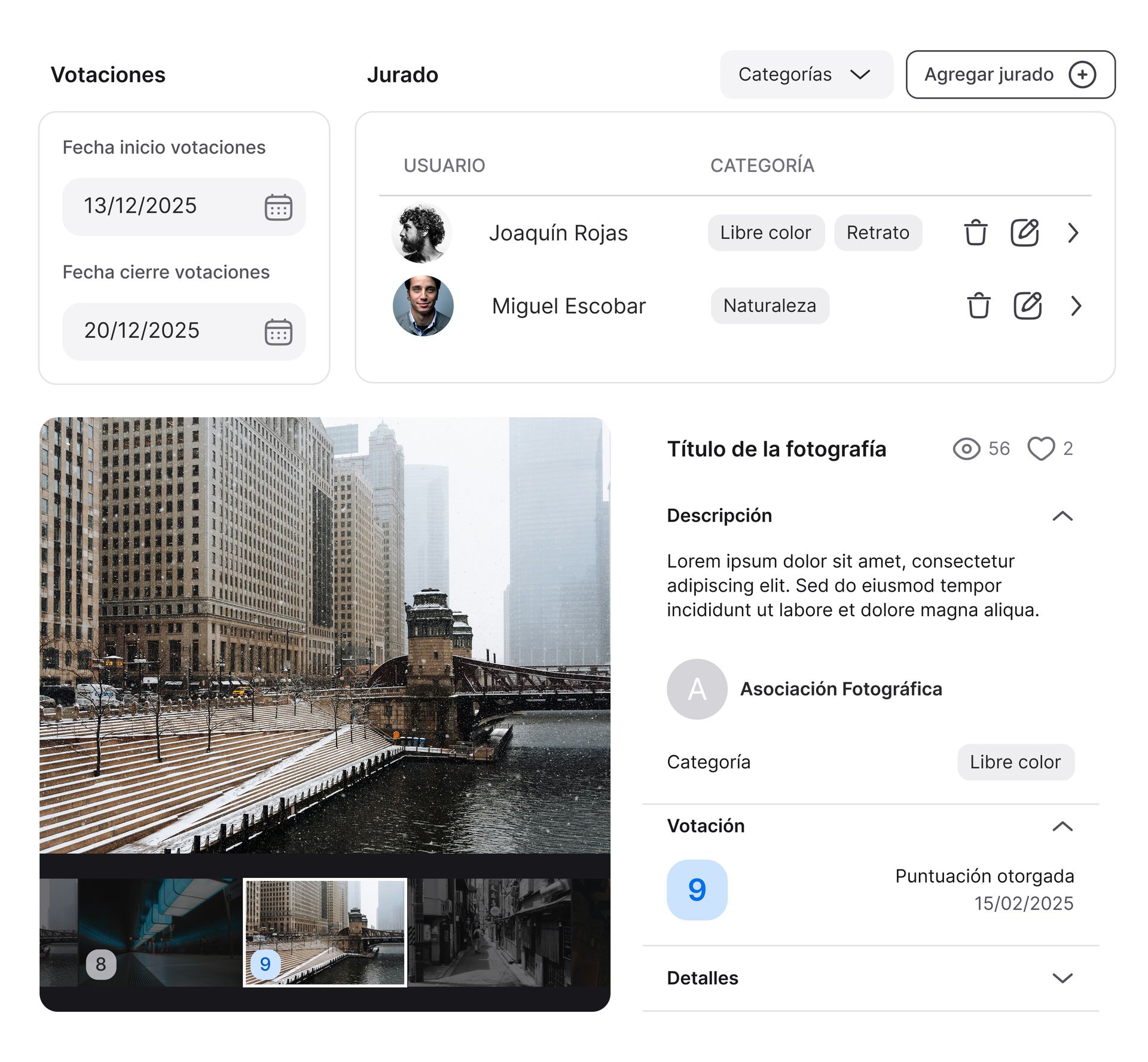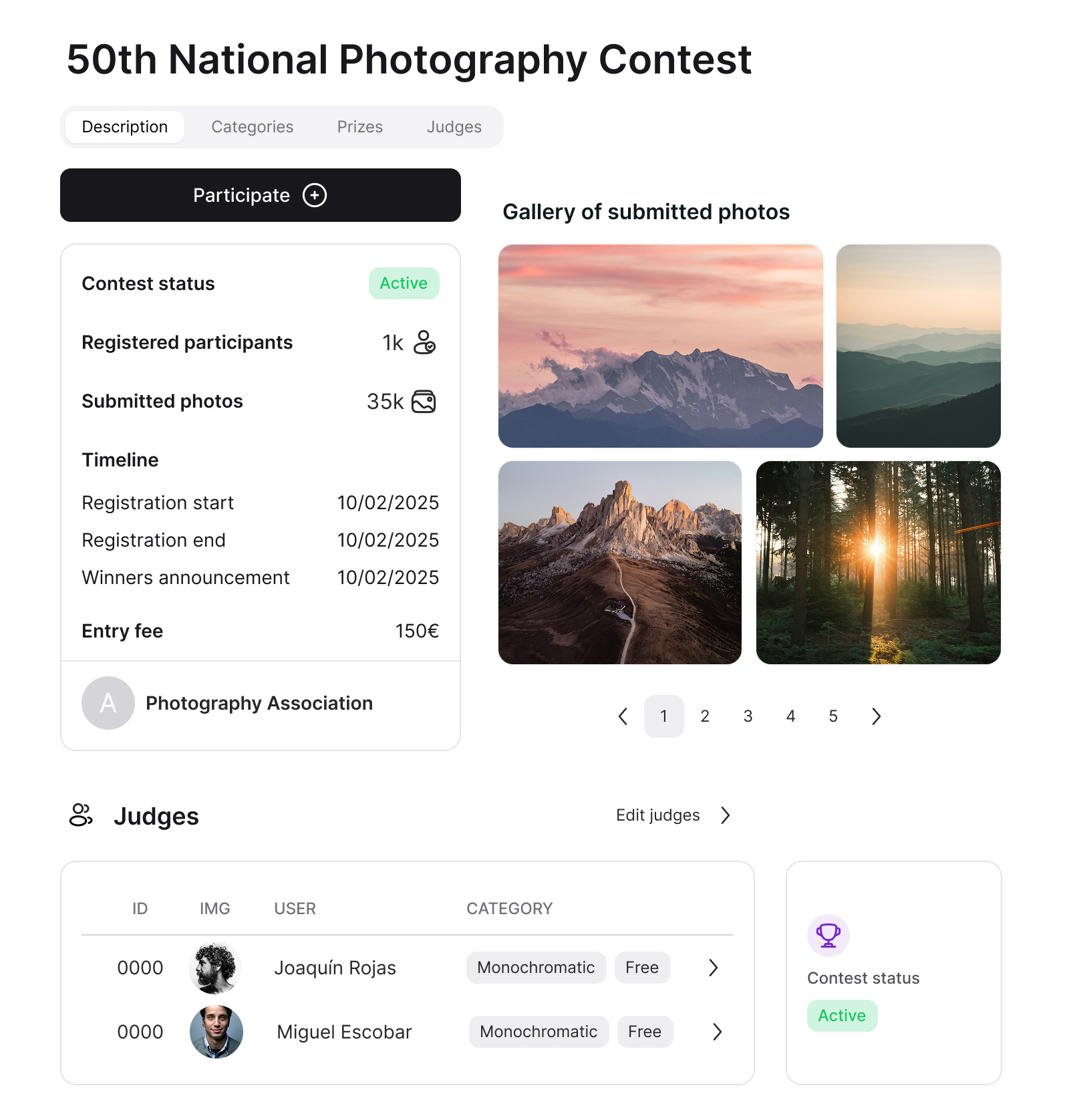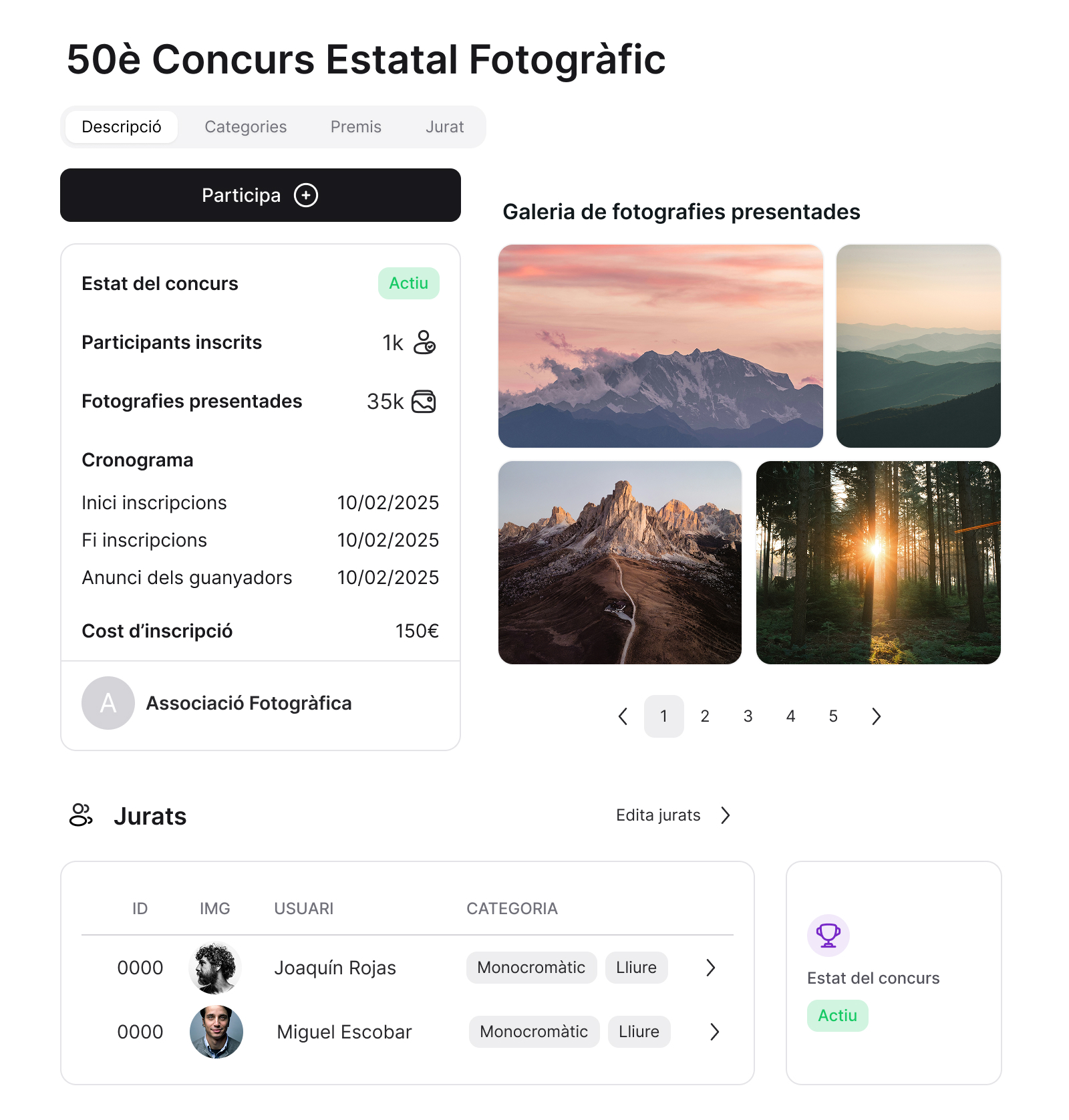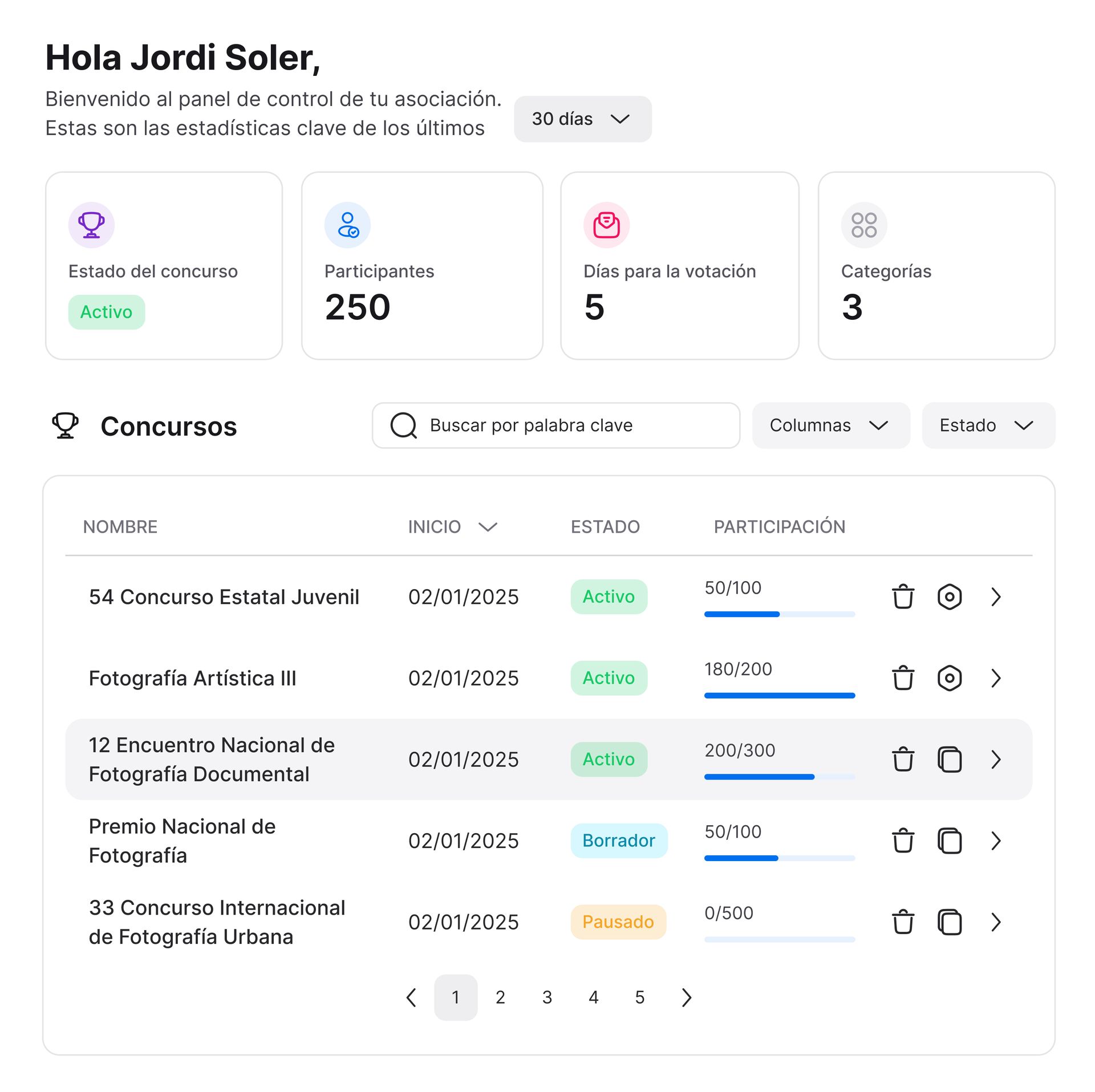 Gestiona inscripciones, fotos, jurado y resultados en un solo panel.