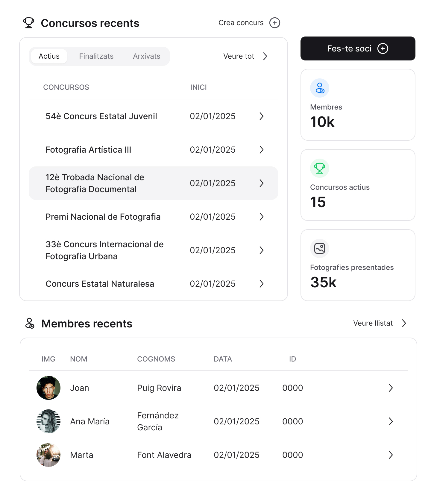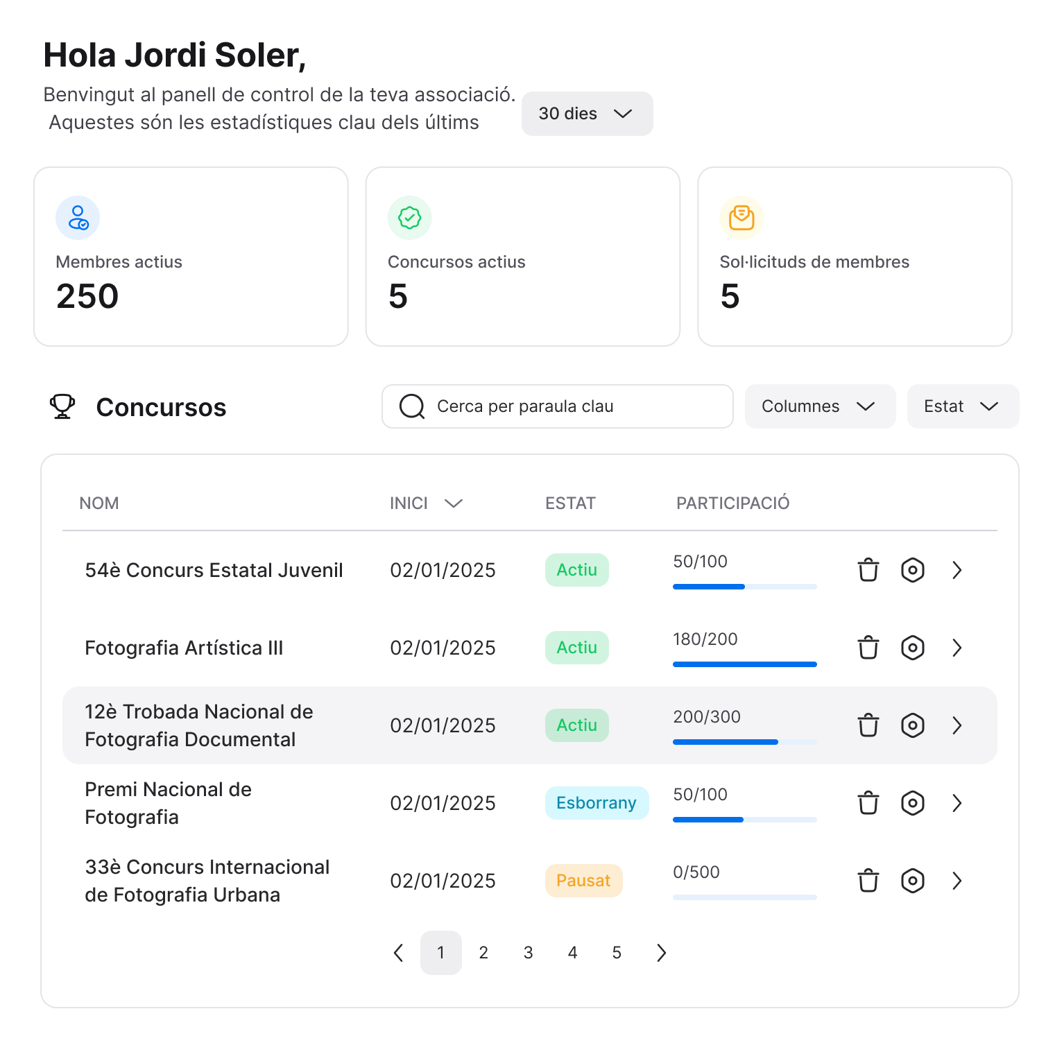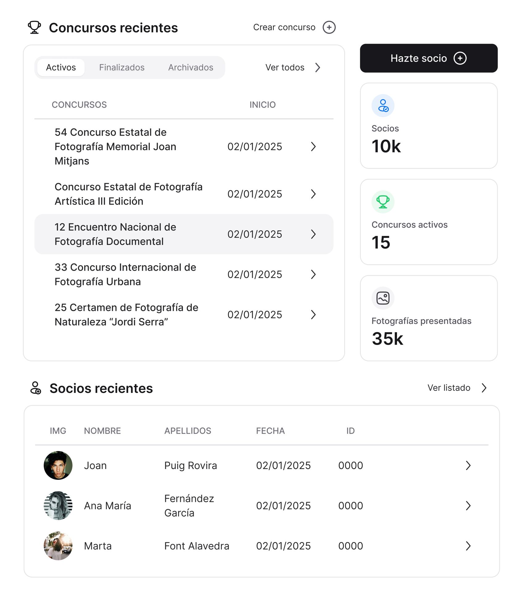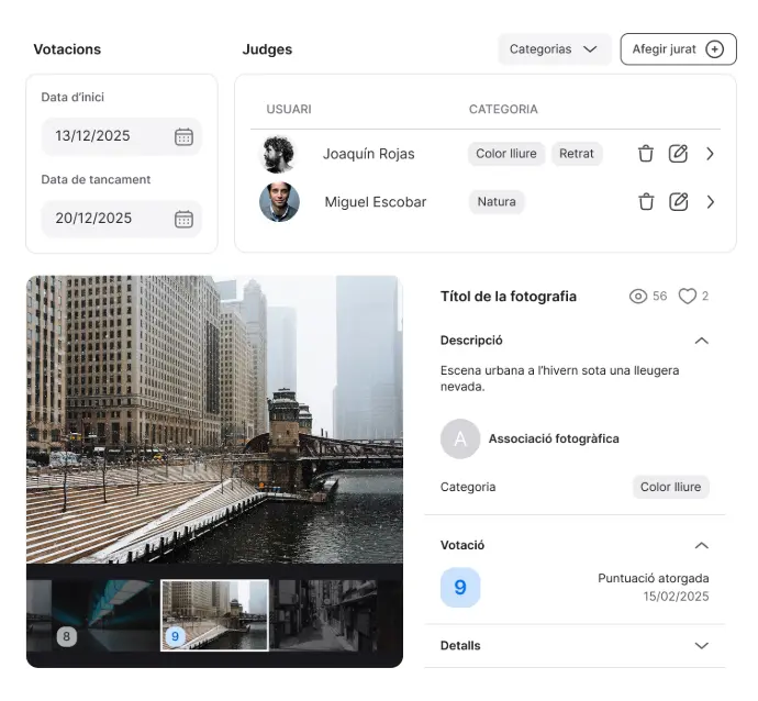 Gestiona inscripciones, fotos, jurado y resultados en un solo panel.