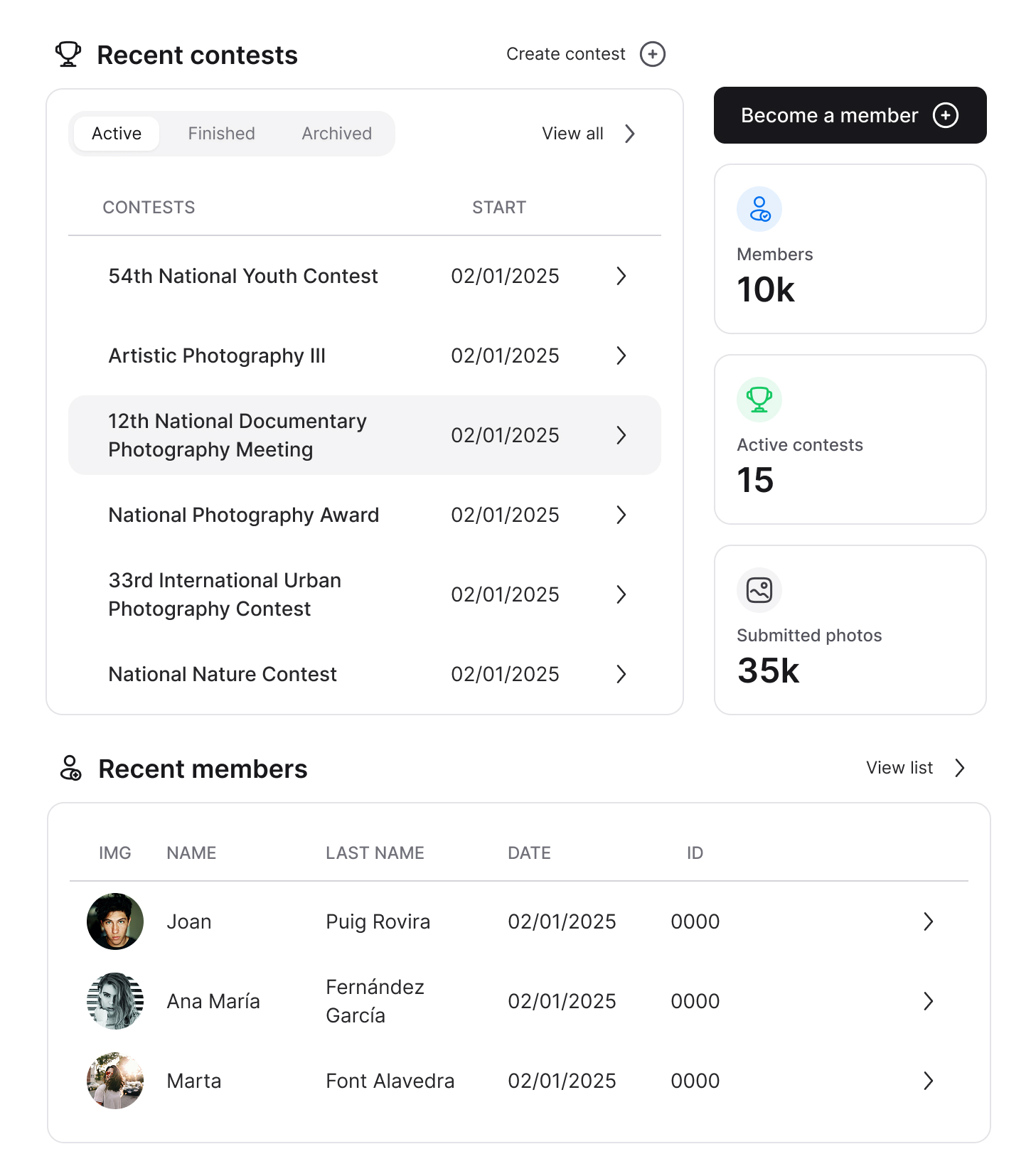 Picstar te ayuda a lanzar concursos de fotografía, cobrar inscripciones y gestionar a tus miembros de forma sencilla y profesional.