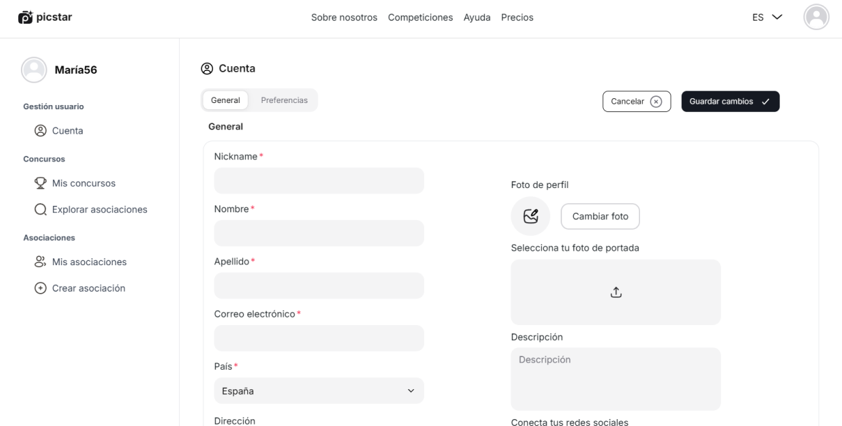 Desde tu panel de usuario puedes actualizar tu perfil, modificar tus datos y acceder a tus concursos y asociaciones.